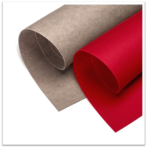 Low reaction to fire and high abrasion resistance decorative synthetic felts in plain and mottled colours with a distinctive surface that is pleasant to the touch
