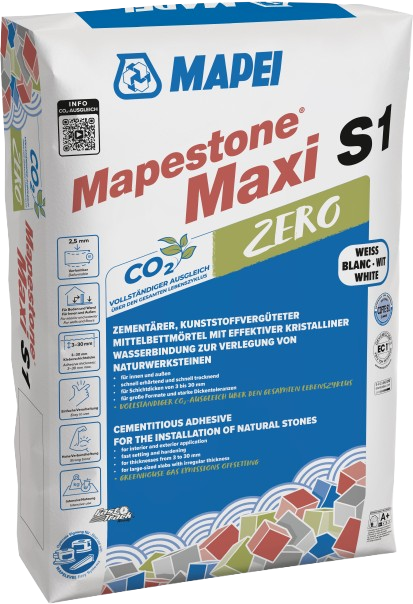 Mapestone Maxi S1 Zero White is available in High-quality, deformable, cementitious, fast-setting, polymer-modified, white thin, and thick-bed mortar with effective crystalline water binding for layer thicknesses of 3-30 mm indoors and outdoors areas. Ideally suited for laying natural stone, even with large thickness tolerances, for large formats, also suitable for porcelain stoneware. Very low emission with offset of the remaining greenhouse gas emissions.
