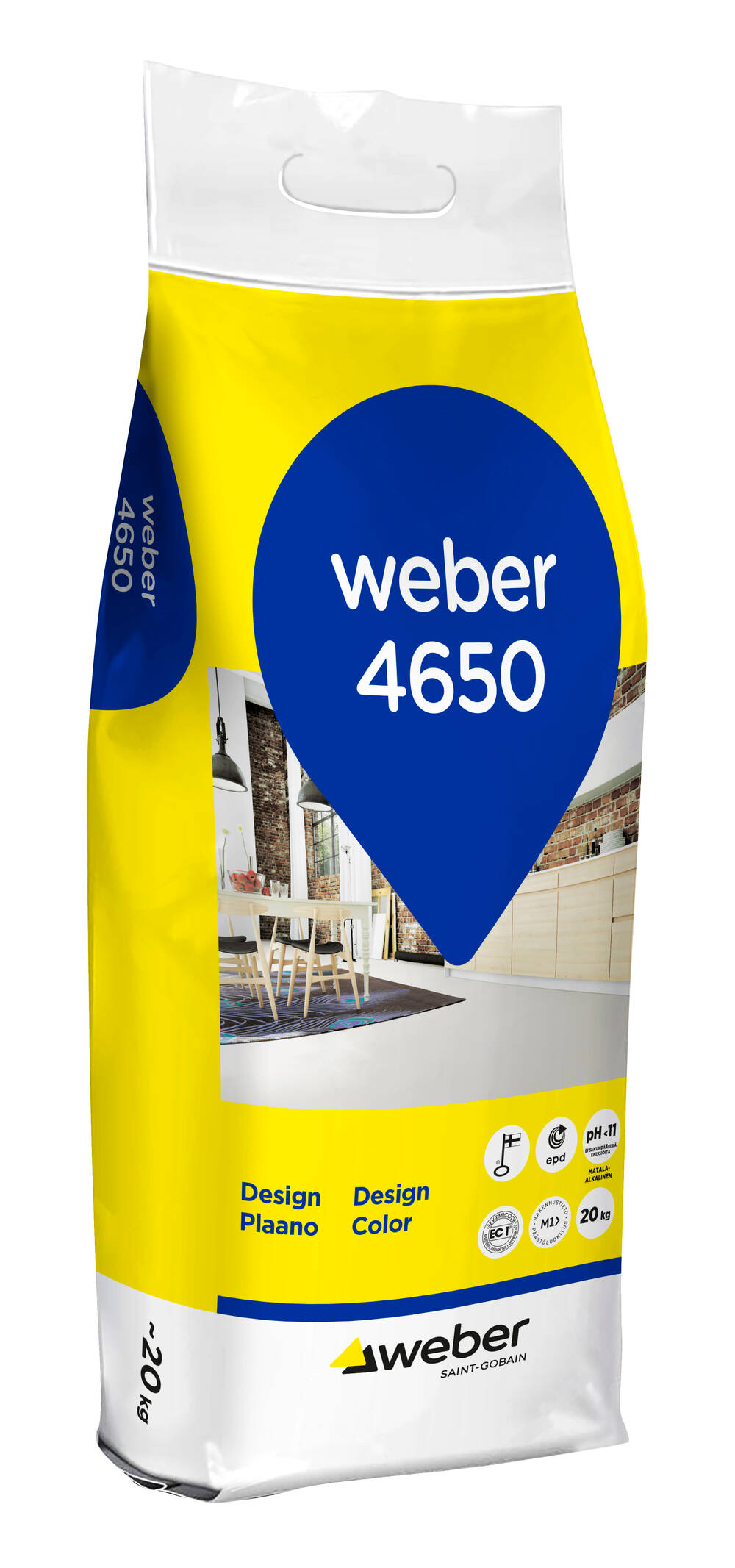 weber 4650 Design Color (FIN: weber 4650 Design Plaano) is a cement-based, colored, fast drying and self-smoothing floor screed. The product is designed to form a surface layer for dry areas such as commercial buildings, offices, schools, hotels and residential buildings. The surface is vivid and the end result is not to be compared to painted surfaces. It is pumpable, fast setting and fast drying.