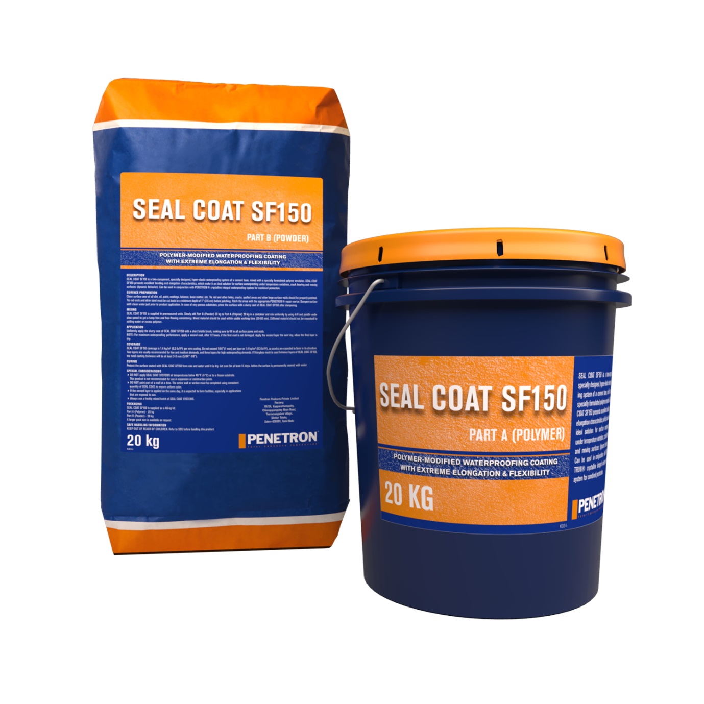 SEAL COAT SF150 is a two-component, specially designed, hyper-elastic waterproofing system of a cement base, mixed with a specially formulated polymer emulsion. SEAL COAT SF150 presents excellent bonding and elongation characteristics, which make it an ideal solution for surface waterproofing under temperature variations, crack bearing, and moving surfaces (dynamic behavior). Can be used in conjunction with a PENETRON® crystalline integral waterproofing system for combined protection.