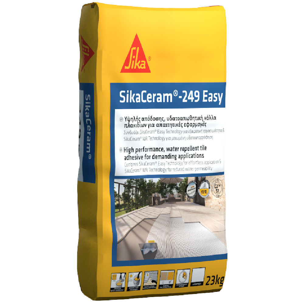 SikaCeram®-249 Easy is a flexible, high performance water repellent cementitious tile adhesive with high polymer content, aggregates, additives and admixtures. Its specially enhanced formulation is based on two new SikaCeram® technologies, (SikaCeram® Easy Technology and SikaCeram® WR Technology).