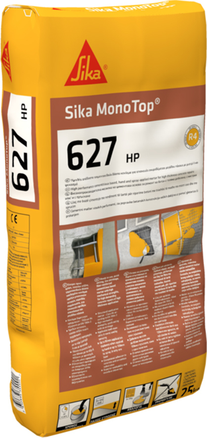 Sika MonoTop®-627 HP is ready to use, quick setting, low shrinkage, cementitious-based mortar, reinforced with special synthetic microfibers for demanding concrete repairs of high thickness application by hand or wet spray technique.