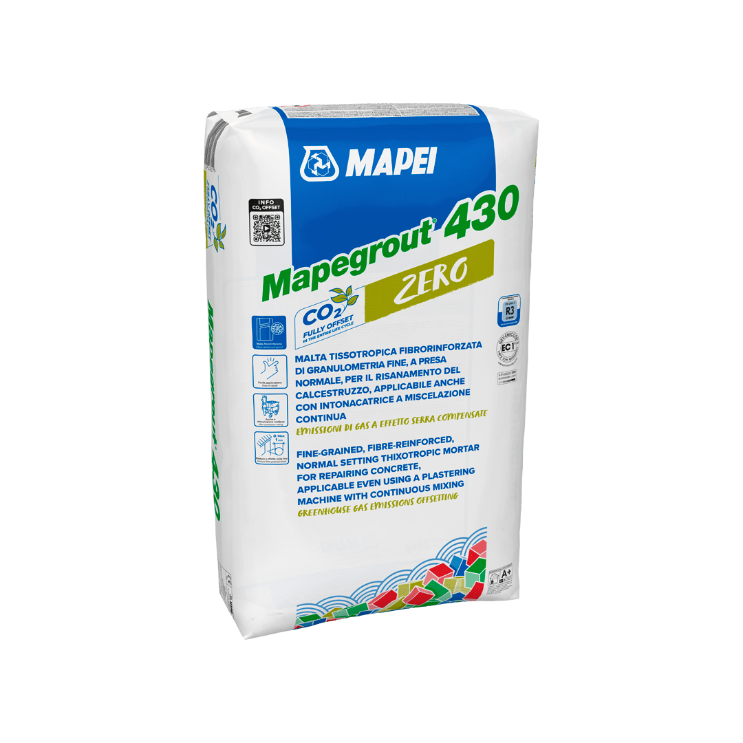 MAPEGROUT 430 ZERO is a pre-blended, compensated-shrinkage mortar in powder form made from cementitious binders, selected fine-grained aggregates, special additives and synthetic fibres according to a formula developed in the MAPEI R&D laboratories. It is used to reintegrate concrete around steel reinforcement in degraded concrete structures and may be applied with a continuous-feed mortar pump.