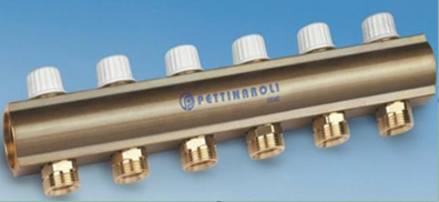 Brass manifolds for the distribution of fluids within a heating system, made from drawn brass rod and then machined. These products differ in the main components that characterise each series. The simplest type of brass manifold consists of the main body only, while the others have additional components ranging from simple connectors to more complex configurations equipped with control valves, thermometers and/or flow meters. Some series include double manifolds, i.e. configurations where there is a flow manifold and a return manifold connected by clamps. Within each manifold series there are different variants depending on the length of the main body, the number and diameter of the outlets/inlets and the main body of the manifold. For the purposes of this study, the extremes of each series were considered, i.e. the smallest variant (lowest mass and number of outlets) and the largest variant (highest mass and number of outlets).