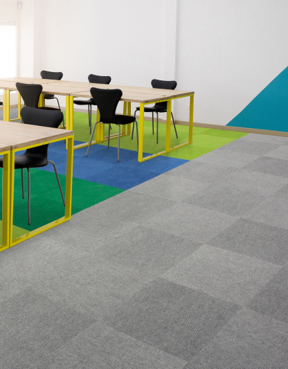 Fibre Bonded carpet tiles 50cm x 50cm tiles on a BioBase® backing, using 85% Polypropylene 15% fibre. BioBase® recycled backing