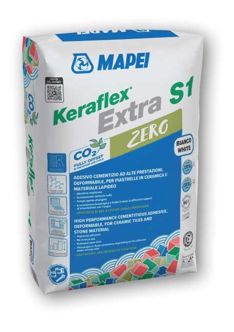 Keraflex Extra S1 Zero white is a high-performance, deformable cementitious adhesive with variable rheology, with no vertical slip or with high wetting capacity, extended open time, with very low emission of volatile organic compounds and fully offset Greenhouse Gas emissions, for ceramic tiles and stone material including in large format.