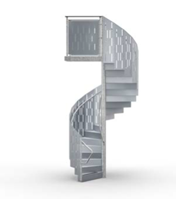 Ståltrappa i plåt är en spiraltrappa bestående av fyra huvudkomponenter för inom- och utomhusmiljöer. Räckesfyllning, handledare, plan och håldurk samt steg av ZM310/zinc-magnesiumbelagd plåt. Centrumrör består av varmvalsat och förzinkat stål.