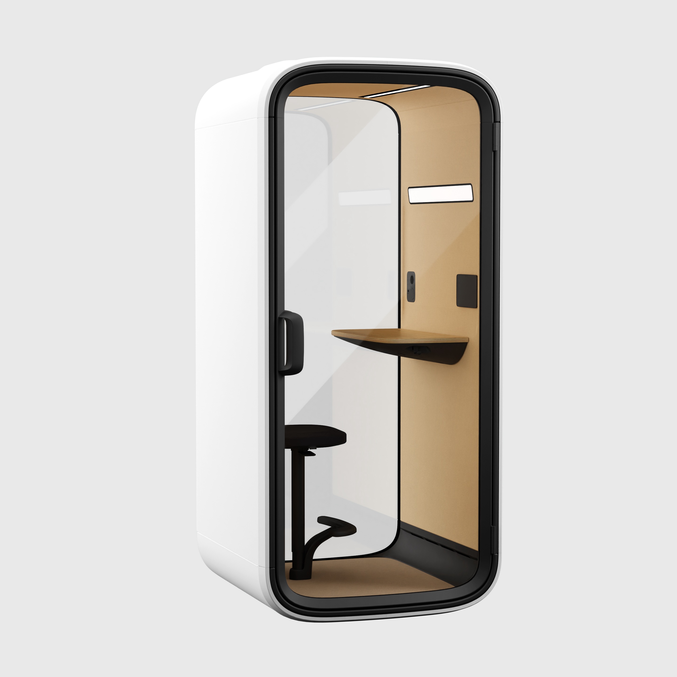 Framery One Compact is a convenient workspace for one person. The sound insulation standards and echo-free acoustics keep you free from outside noise or distractions. Ventilation speeds ensure high air quality inside the pod, keeping you fresh and focused. Adjustable lighting from the ceiling light and front-facing video light creates a perfect working atmosphere for video and phone calls. The spacious desk perfectly serves basic work needs, and the height- adjustable stool ensures good ergonomics. The pod's exterior panels are made from powder coated steel. The matte black framing structures are made from aluminum, and features sound-control laminated glass. The interior walls and roof are made of a light steel structure with PET sound- absorbing material. The floor is an anti-static and stain resistant low loop pile carpet.
