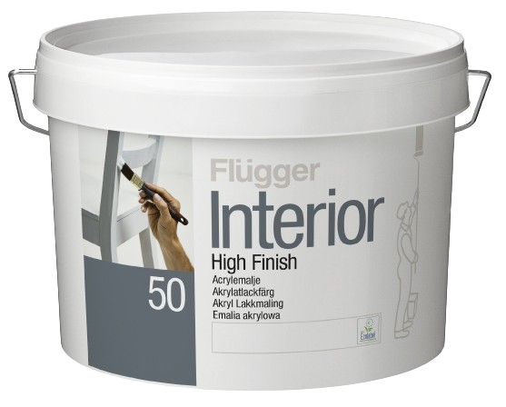 Flügger Interior High Finish 50 is water-based enamel for finishing wood and metal indoor surfaces. It is an acrylic enamel with a smooth, supple consistency and good coalescence.