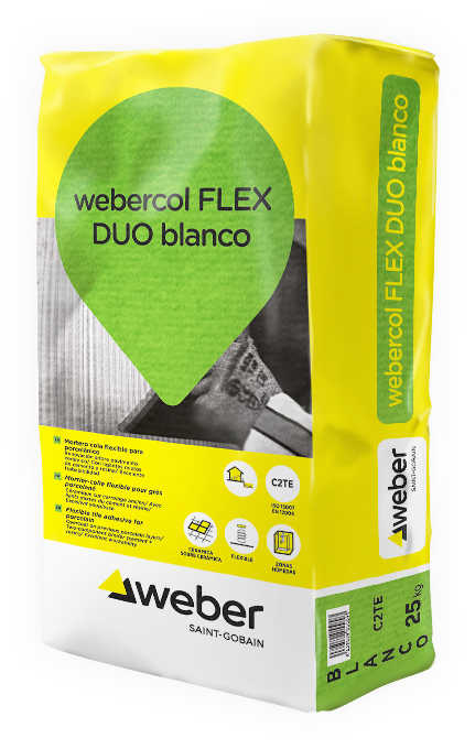 Webercol flex duo es un adhesivo flexible y deformable para la colocación de todo tipo de baldosas cerámicas, de formato pequeño y mediano, en la realización de revestimientos en muros y pavimentos tanto interiores como exteriores, y especialmente recomendado para zonas sujetas a deformaciones térmicas como fachadas expuestas y sistemas de calefacción radiante.
