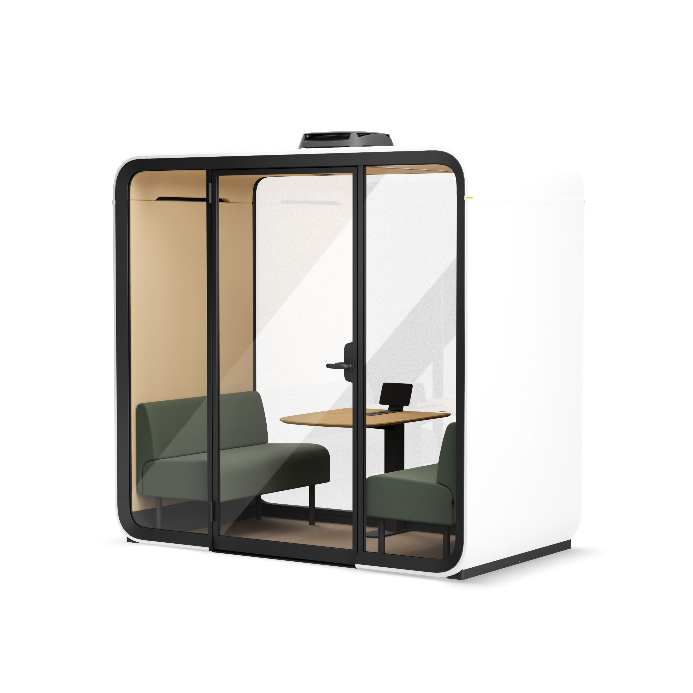 Framery Four is an advanced meeting pod for up to 4 people. The sound insulation standards and echo-free acoustics keep you free from outside noise or distractions. Ventilation speeds ensure high air quality inside the pod, keeping you fresh and focused. You can also adjust the direction of the airflow. The pod offers optimal and adjustable lighting for hybrid and face-to- face meetings. The sofas of Framery Four have been designed with attention to detail. You can add pillows to gain even more comfort. The pod has a proper-sized table. The pod's exterior panels are made from powder coated steel. The matte black framing structures are made from aluminum and it also has sound control laminated glass. The interior walls and roof are made of a light steel structure with PET sound-absorbing material. The floor is an anti-static and stain resistant low loop pile carpet.