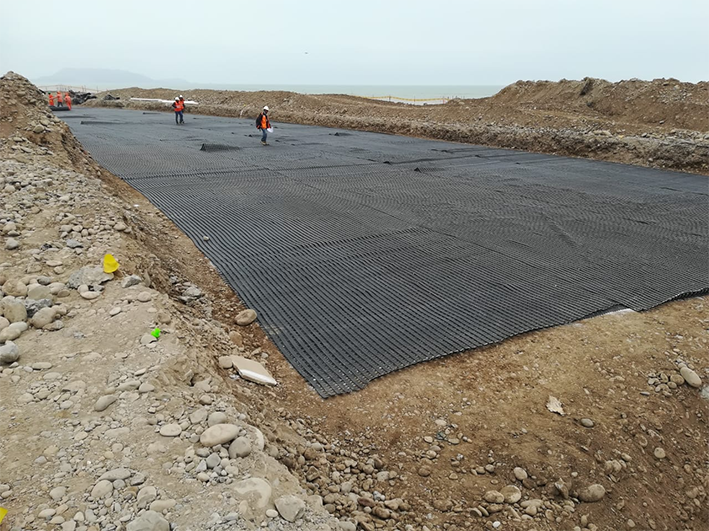 The geogrid supports the soil layer and minimises stress transfer to the underlying layers.
