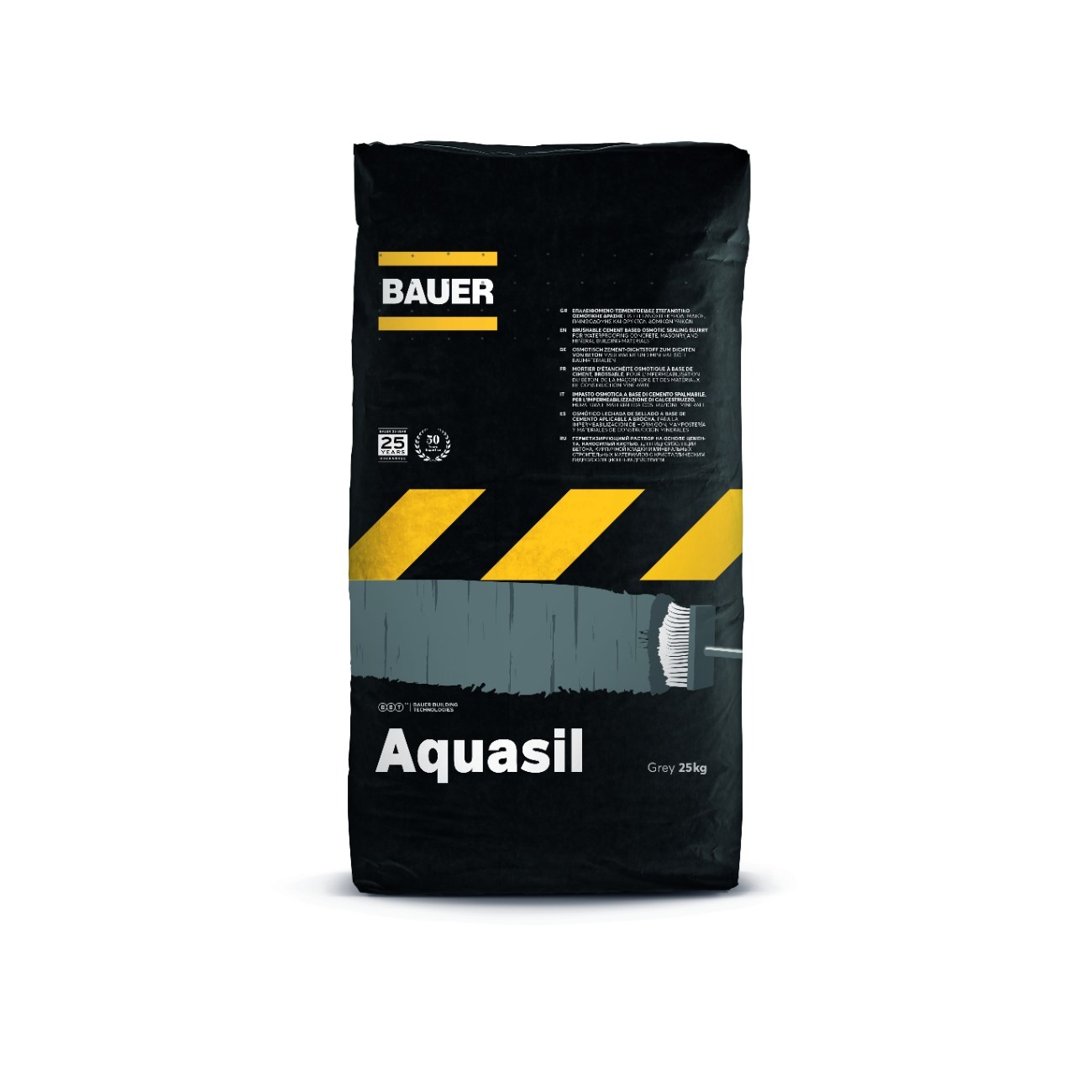 - Aquasil is an osmotic, brushable cement-based sealing slurry for complete and permanent waterproofing of concrete, brickwork, plaster and generally mineral construction materials. Ideal for basements, tanks, tunnels, foundations, canals, etc. Aquasil guarantees complete waterproofing under positive or negative hydrostatic pressure and the surface stays vapor permeable. Suitable for contact with drinking water. May be backfilled, covered with tiles, marble, stone or other covering. It may also be plastered or left as a finish coat. Aquasil is in powder form and only water is added before application. The active ingredients penetrate deep (osmotic) in hairline cracks and pores of concrete or masonry structural elements, achieving excellent adhesion and permanently sealing of surfaces from water penetration for many decades.