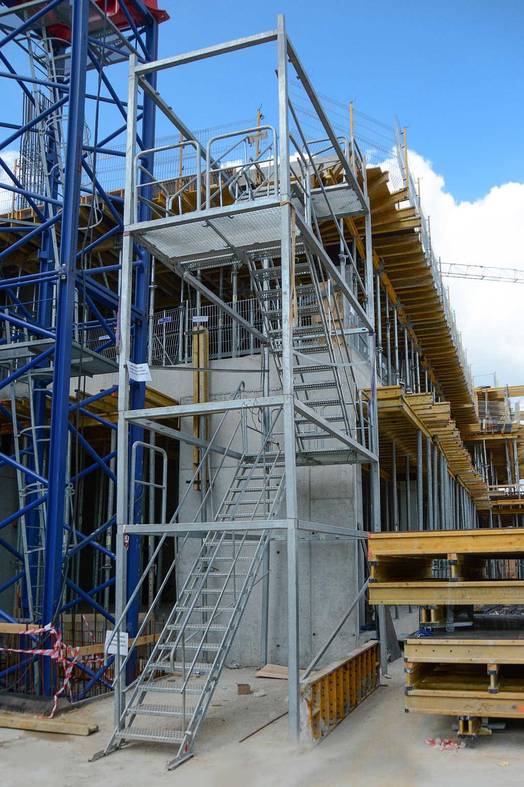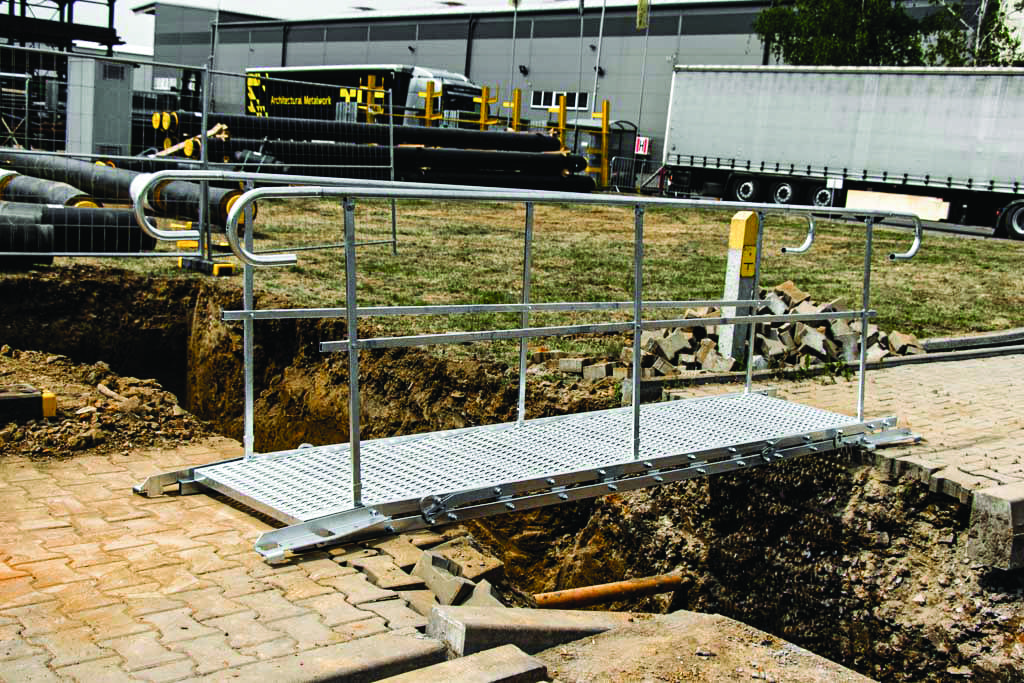 Temporary access stairs (TAS, SST) are a safe solution that makes a great alternative to usually used, makeshift wooden structures. Modularity and universal purpose allows to use the system wherever there is a need of safe overcoming small and significant level differences. They have smooth angle regulation for better adjustment to required conditions. In order to increase visibility at the construction site, handrails are painted in yellow.
