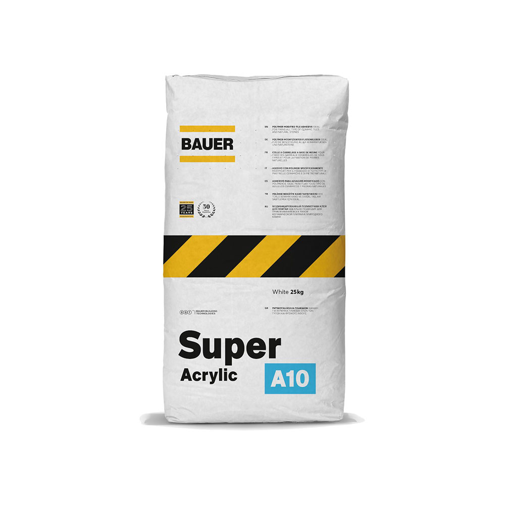 - Super Acrylic is a cement-based tile adhesive enhanced with polymers to deliver exceptional resistance to frost and humidity, along with improved adhesion and bonding properties. It is suitable for affixing both absorptive and less absorptive tiles on walls and floors, catering to indoor and outdoor installations alike. Whether in dry or wet environments, Super Acrylic offers reliability and durability. It is compatible with various substrates including brick walls, concrete or cement base mortars, plaster, rendering, cement and plaster boards, and fiber cement, it ensures secure tiling applications.