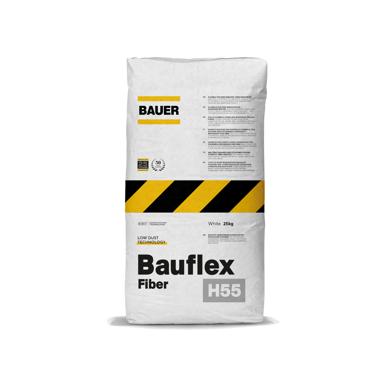 - Bauflex Fiber is an advanced cement-based tile adhesive with LOW DUST technology reinforced with fibers, designed for high-performance applications. Its exceptional thixotropic properties and superior adhesion make it ideal for fixing various types of tiles, including ceramic, porcelain, vitrified tiles, mosaics, and natural hard stone, on diverse surfaces such as walls, floors, and worktops. Whether it’s interior or exterior, dry or wet environments, Bauflex Fiber offers durability against cracking from thermal changes, frost, and moisture, making it suitable for showers, swimming pools, heated screeds, and substrates like brick, concrete, lightweight blockwork, and cement boards. Old layers of ceramic tiles or wooden floors can be securely fixed with Bauflex Fiber, provided appropriate priming and membranes are used.