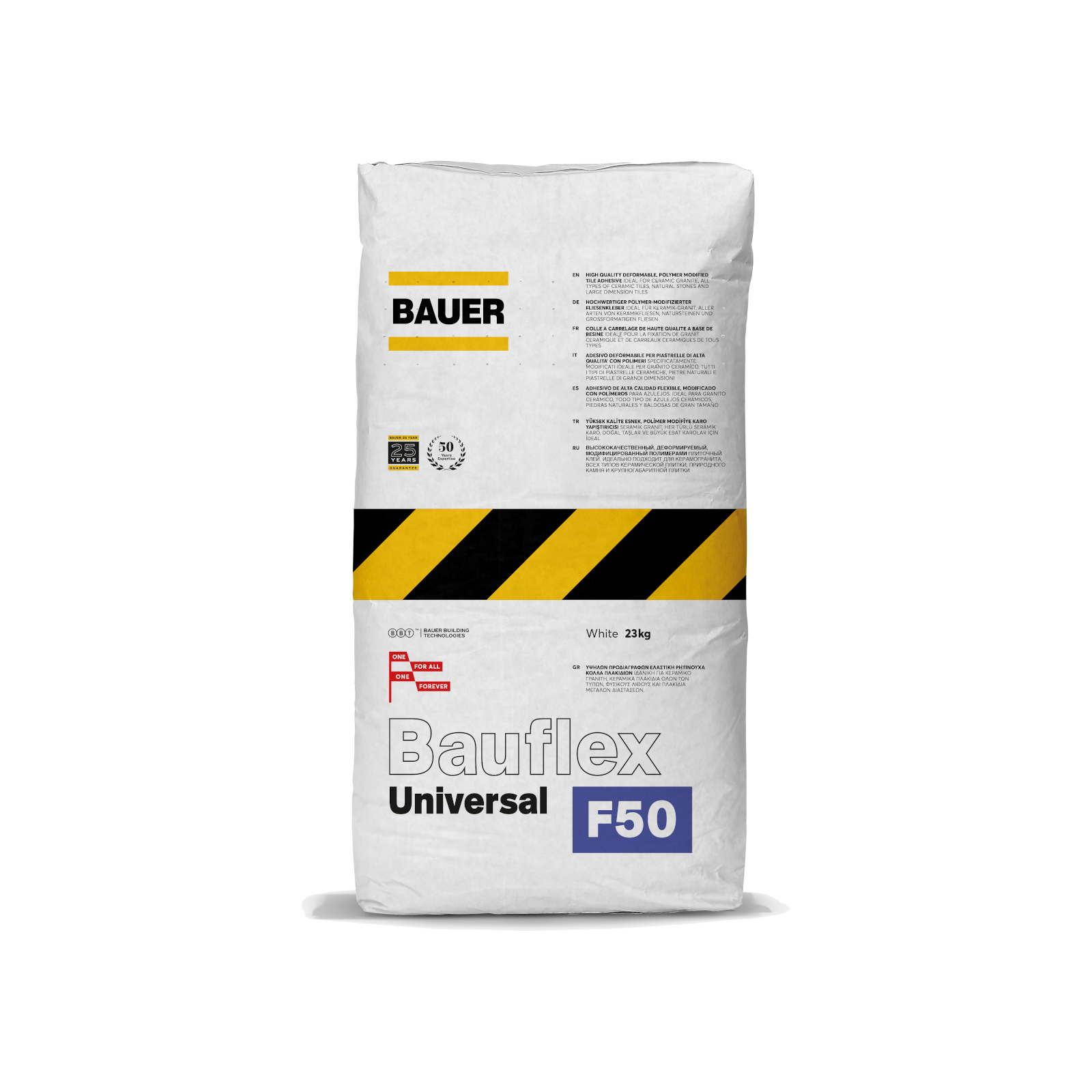 - Bauflex Universal is a high-performance polymer-modified cement-based tile adhesive with exceptional flexibility and deformability along with high thixotropy, ensuring excellent adhesion to a variety of surfaces. It is ideal for fixing tiles on diverse substrates such as brick, concrete, render, and challenging surfaces like swimming pools, old tile layers, and areas with underfloor heating. Compatible with a wide range of tiles including ceramic, porcelain, vitrified, mosaic, and natural hard stones like marble and granite, it’s particularly suited for large-format tiles. This adhesive is perfect for both interior and exterior applications, resisting cracking from thermal changes, frost, and moisture. Its versatility extends to various settings including walls, floors, worktops, showers, and even heated screeds.