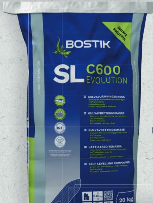 BOSTIK SL C600 Evolution is a very easy-flowing cement-based floor screed optimized for minimal CO2 footprint. Can be laid in layers 2-30 mm. Resistant to moisture damage.