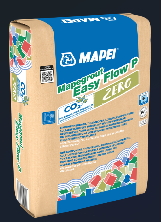 Mapegrout Easy Flow P Zero is one-component, fibre-reinforced, shrinkage compensated, sulphate-resistant thixotropic mortar, with high crack resistance, even when subject to dynamic cyclical loads, suitable for repairing concrete structures with a rendering machine.