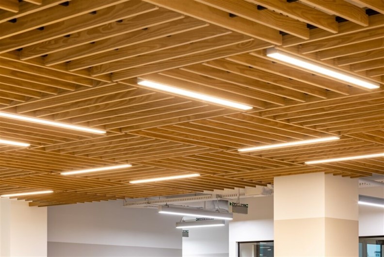 Shiluvit panels are installed on regular T24 or T15 suspension systems, the most common and easy to use systems available. Alternatively, open cell panels can be installed on a wood grid, a solution that is denominated open cell Integral ceilings and creates an elegant look with additional depth. No special tools or rails are needed. It makes both installation and dismantling for maintenance very quick and easy, saving lots of work hours and creating a high value-for-money product, considering installation, maintenance and purchase costs. The installed ceilings create an elegant, clean, monolithic look in spite the fact that they consist of many panels. A small gap of 5mm between the panels on the longer side allows wood expansion and easy dismantling