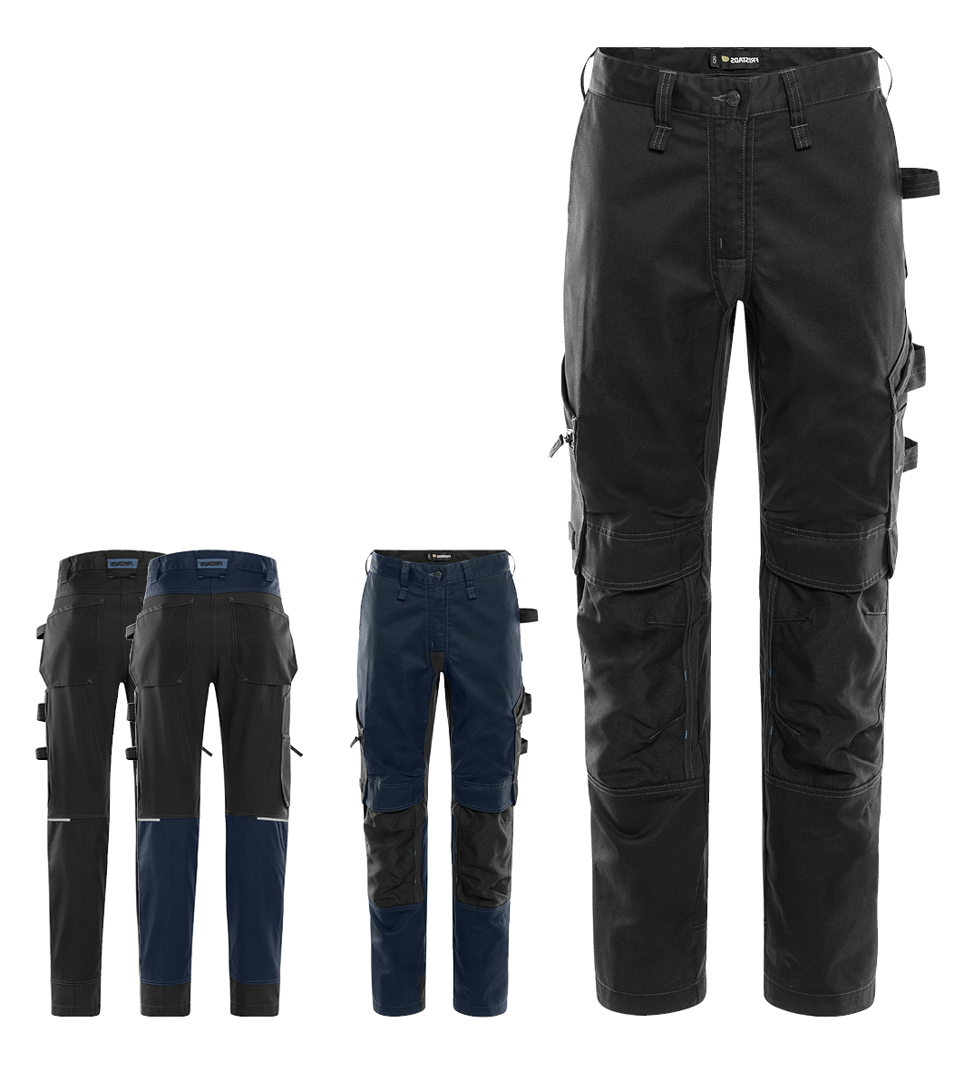 Workwear trousers with panels of 4-way stretch material, equipped with all the necessary functions for craftsmen. Made of a lightweight and durable material with mechanical stretch, partly of recycled polyester.