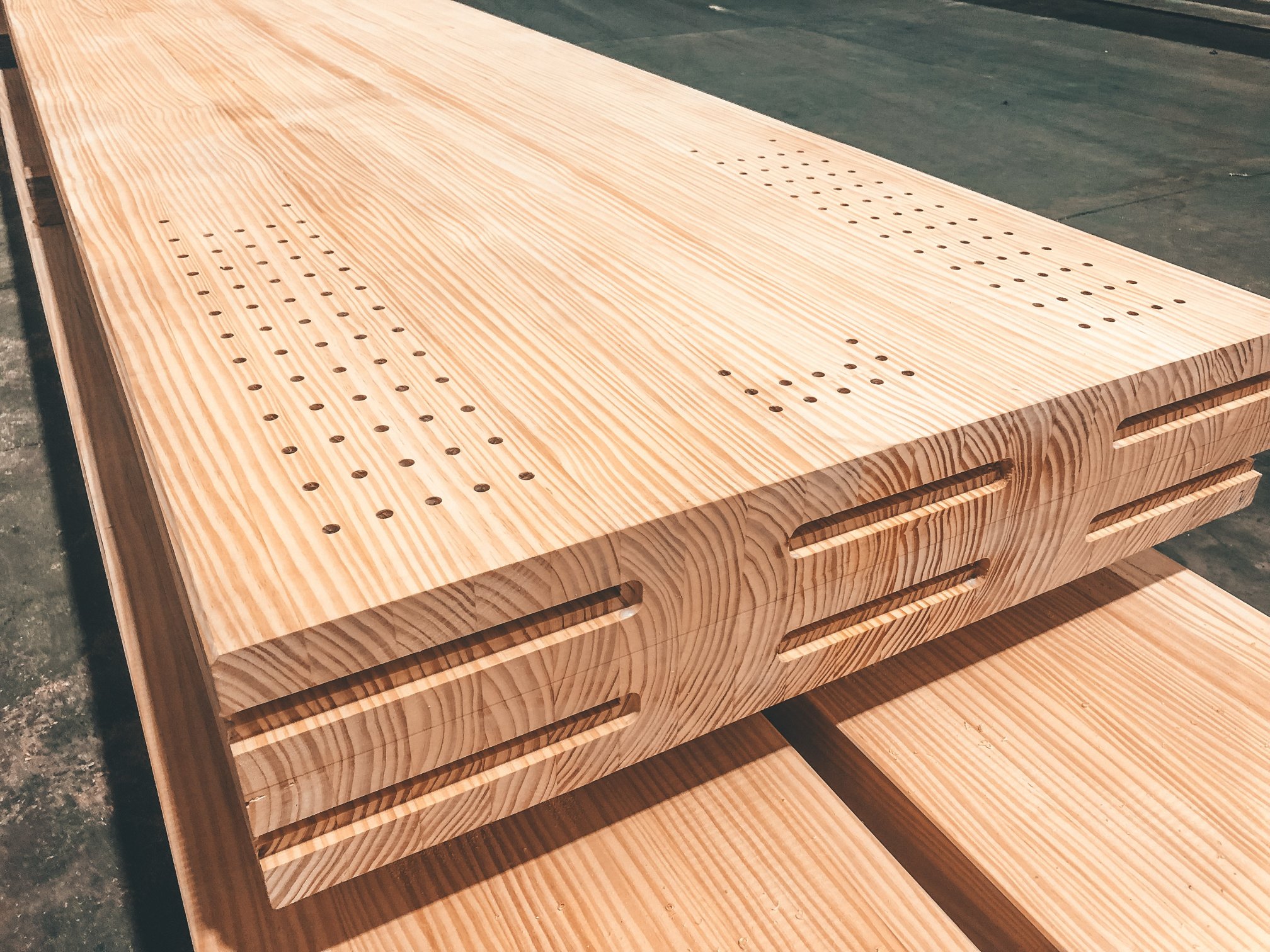 Beam of structural timber consisting of at least two lamellas, face-bonded parallel to each other to be used structurally in buildings and bridges. Lamellas are manufactured with machine strength-graded timber according to EN 14081. End-joints and face-bonds glued with formaldehyde-free, wet-curing polyurethane. Sizes up to 300 x 1000 x 12000 mm can be manufactured. The service life of the product can be estimated at 100 years.
