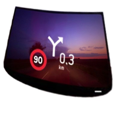 The HUD system (Head-Up Display) makes driver and vehicle information easily accessible by creating a virtual image in front of the car. Without taking the eyes off the road, drivers are informed about important data such as current speed, speed limits, navigation data or engine warnings. The combination of perfectly matching inner and outer glass panels and a customized wedged PVB ensures the sharpest HUD image possible.