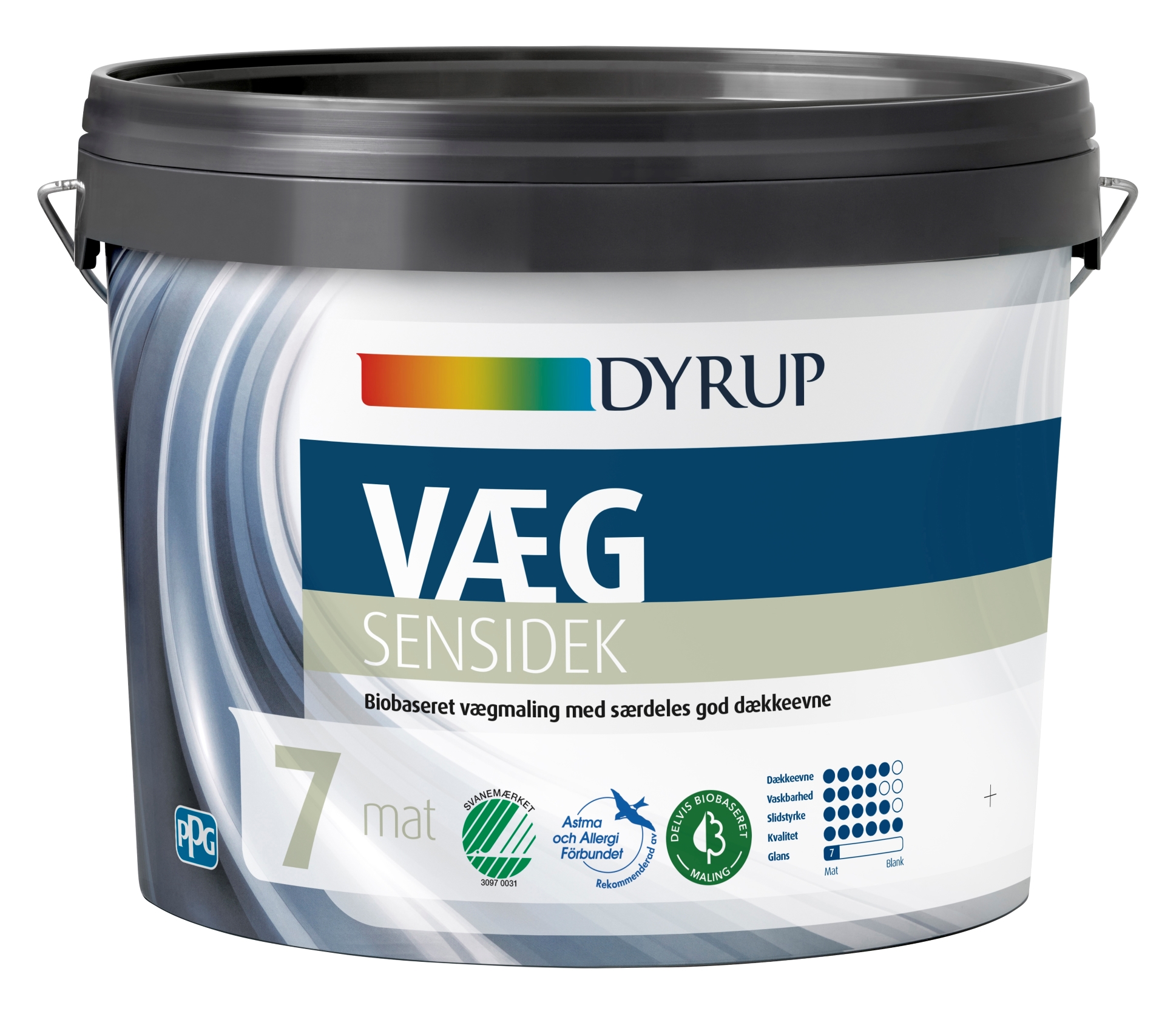 Dyrup VÆG Sensidek: A Biobased mat wallpaint with nordic swan and Swedish astma & allergic labels. Suitable for walls and ceilings in all dry rooms.