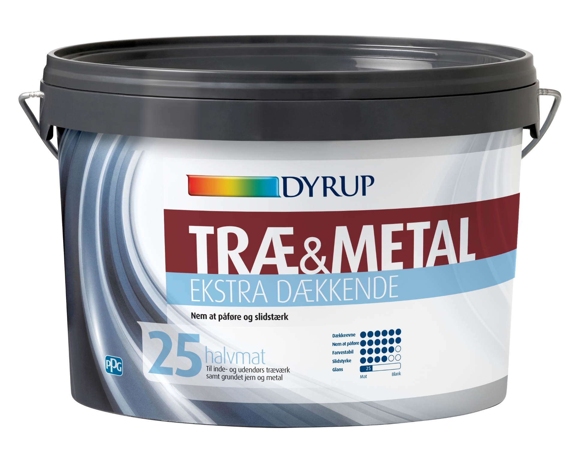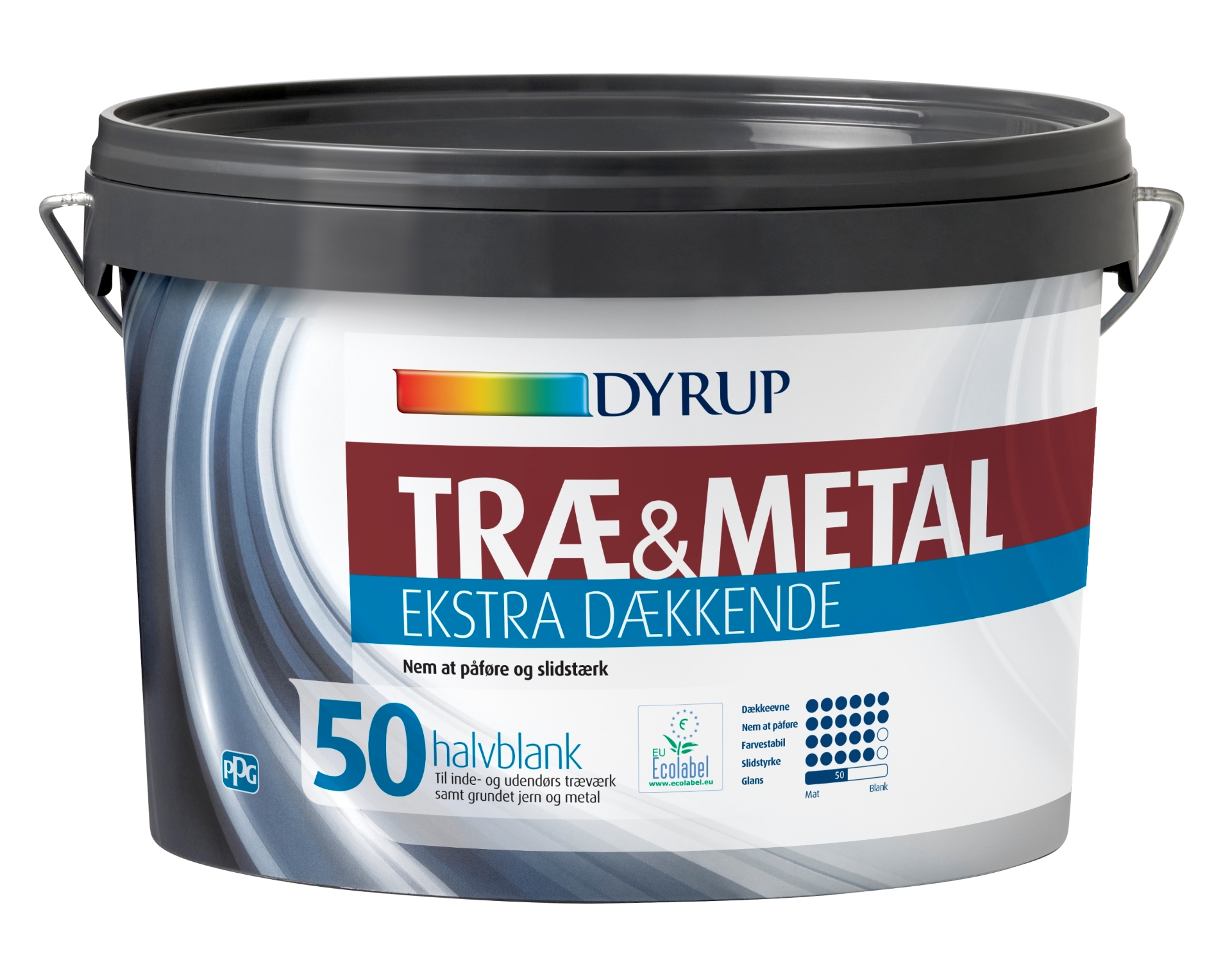 DYRUP T&M 50 EKSTRA DÆK : A waterbased 100% aryllic semi gloss wood, trim and metalpaint. Ecolabel and scrubclass 1. suitable for all wood and metal all dry rooms.
