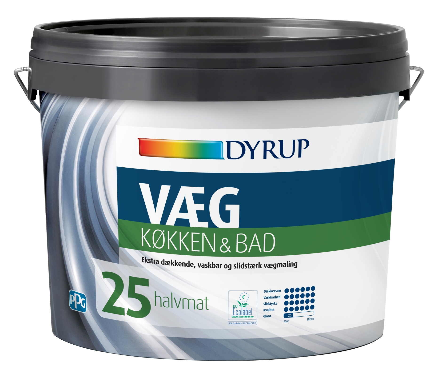 DYRUP VÆG 25 KØK & BAD: A waterbased 100% aryllic satin wallpaint. Ecolabel and scrubclass 1. suitable for walls and ceilings in all dry rooms.