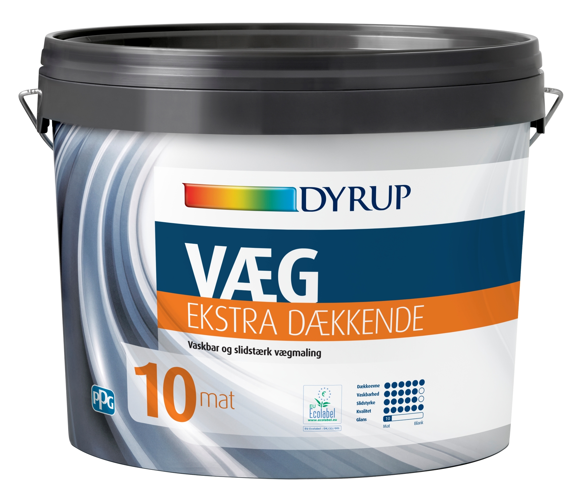 DYRUP VÆG 10 EKSTRA DÆK: A waterbased 100% aryllic semi - mat wallpaint. Ecolabel and scrubclass 1. suitable for walls and ceilings in all dry rooms.