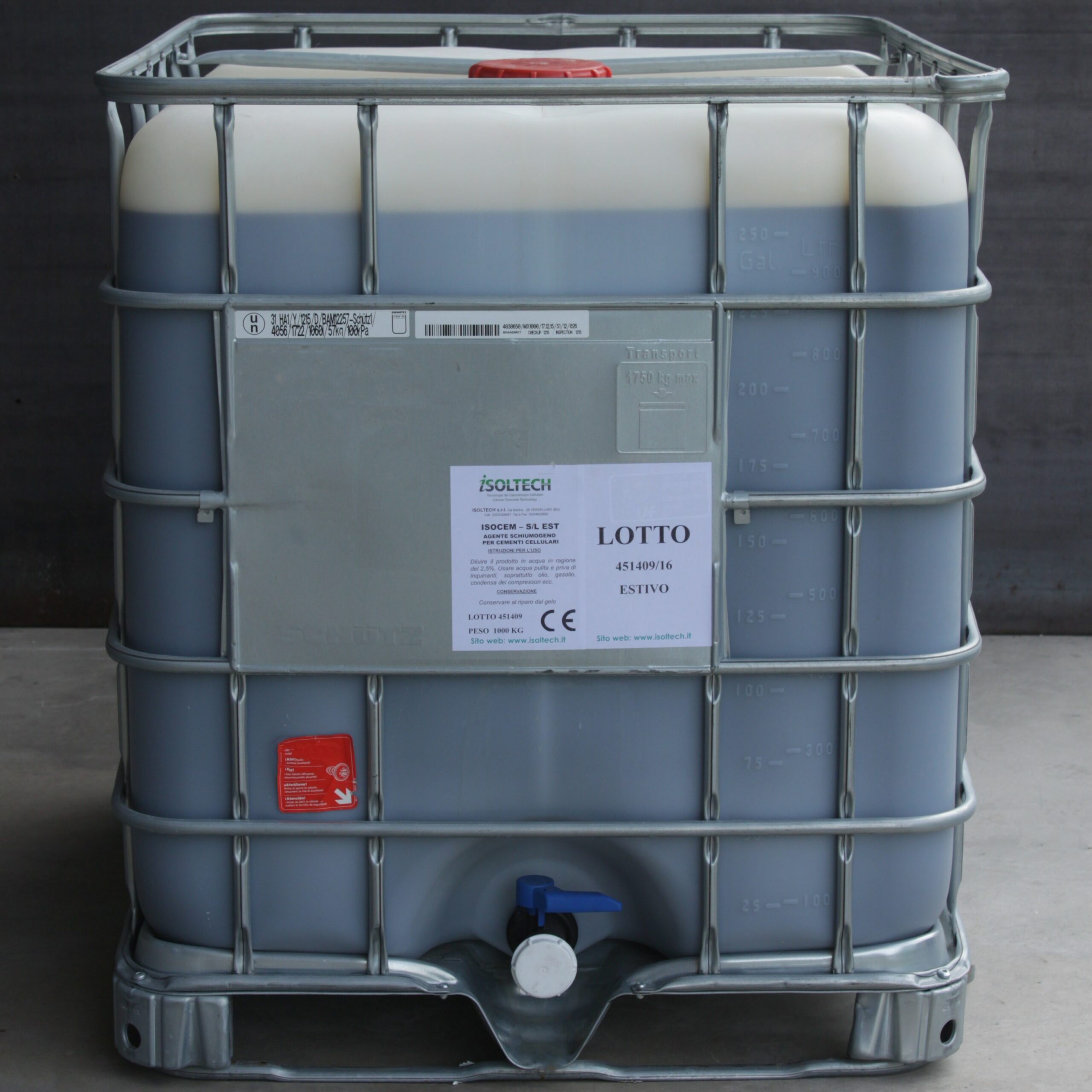 Isocem S/L and S/X are foaming agent intended to produce aerated concrete for special applications. It consists of natural surfactants (neither organic nor synthetic) mixed with raw materials of plant origin that act in synergy with each other. They are meant to be used as foaming agents with special foam generators to produce aerated concrete. The main difference between the two types of foaming agents is the amount of surfactant used in the formula. Indeed, ISOCEM S/X is the most concentrated, as it has almost the double content of soap (surfactant) in the formula. Both the foaming agents have the winter and the summer version of themselves. The versions differ because of the presence, in the winter form, of the glycol, used as antifreeze. Its scope is to maintain the physical state of the product, as it avoids the freezing caused by low temperatures.