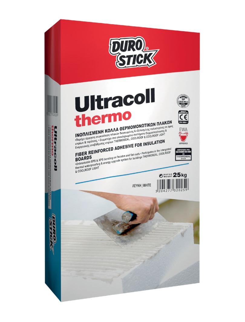 Ultracoll Thermo is a fiber-reinforced cementitious adhesive, fortified with resins that provide excellent flexibility and resistance to moisture. Presents exceptional bonding power and high adhesion on thermal insulation boards made from expanded (EPS) or extruded polystyrene (XPS), polyurethane, cork, etc., on walls made of concrete, plaster, bricks or cement blocks.