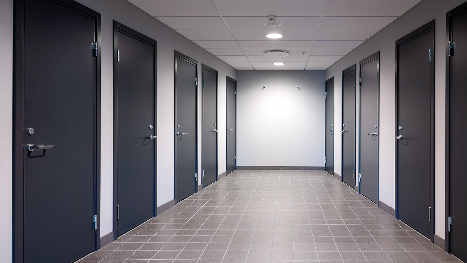 Wooden massive door with a thickness of 48 mm and a steel frame suitable for use in tougher environments where there are requirements for sound reduction, fire resistance and smoke control. Wooden doors with steel frames are common in public areas such as schools, hospitals, and receptions.