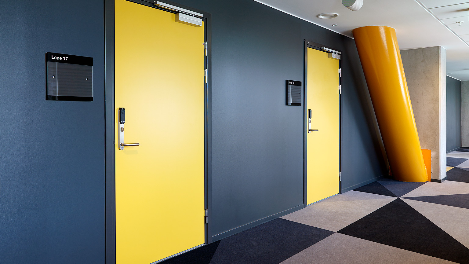 Wooden massive door with a thickness of 64 mm and a steel frame suitable for use in tougher environments there are requirements for sound reduction, fire resistance and smoke control. Wooden doors with steel frames are common in public areas such as schools, hospitals, and receptions.