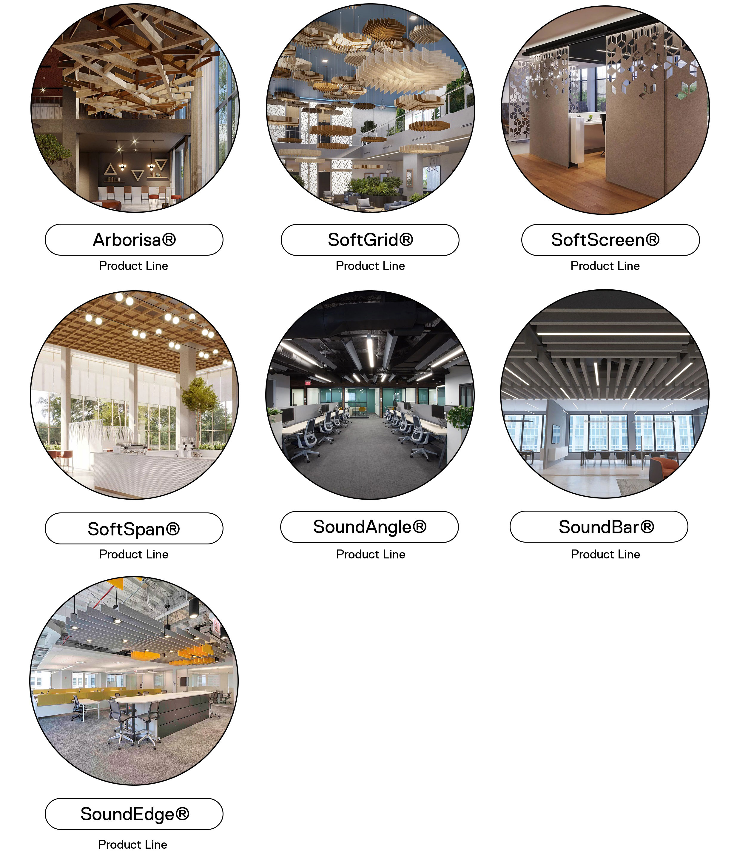 The acoustical material SoftSound® is produced by felting 100% PET plastic (100% non-woven PET, with 60% post-consumer recycled content). It can be recycled completely, as we do not add lubricants or oils during our manufacturing processes. This material provides superior sound absorption for improved acoustics. SoftSound® is the raw material from which our ceiling clouds lines Arborisa™, SoftGrid®, our ceiling baffles lines SoftSpan®, SoundBar®, SoundAngle® and SoundEdge®, and acoustic wall panels SoftScreen® are made.