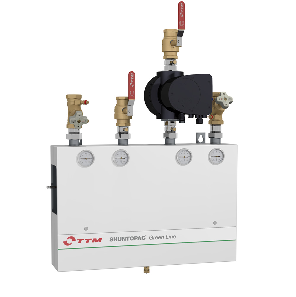 TTM Shuntopac® 20-50 V Green Line is a shunt unit for conventional radiator, ventilation and in floor heating systems and is available as standard with connection dimensions from DN 20 to DN 50. The shunt unit can be equipped with several components of any make and a number of different coupling alternatives.