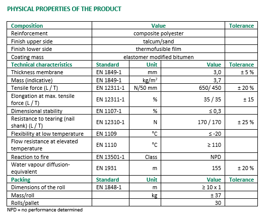 Membrane composed of elastomer modified bitumen and a composite polyester reinforcement. Used as a base layer within a multi layer waterproofing system or as a vapour control layer. The upper surface is finished with talcum/sand. The lower surface is protected by thermofusible film.