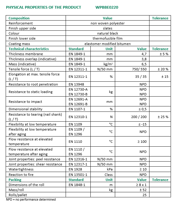 Membrane composed of elastomer modified bitumen and a non woven polyester reinforcement. Used as an upper layer within a single or multi layer waterproofing system. The upper surface is finished with slates and the overlap is protected by a thermofusible film. The lower surface is protected by a thermofusible film.