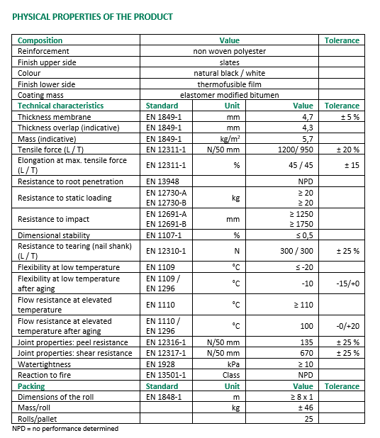 Membrane composed of elastomer modified bitumen and a non woven polyester reinforcement. Used as an upper layer within a multi layer waterproofing system. The upper surface is finished with slates and the overlap is protected by a thermofusible film. The lower surface is protected by a thermofusible film.