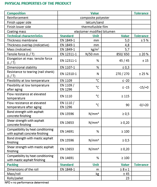 Membrane composed of elastomer modified bitumen and a composite polyester reinforcement. Used as a single layer waterproofing system, underneath asphalt concrete or mastic asphalt, for civil works and car parks. The upper surface is finished with talcum/sand and the overlap is protected by a thermofusible film. The lower surface is protected by a thermofusible film.