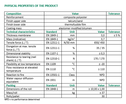 Membrane composed of elastomer modified bitumen and a composite polyester reinforcement. Used as a base layer within a multi layer waterproofing system. The upper surface is finished with talcum/sand. The lower surface is protected by thermofusible film.