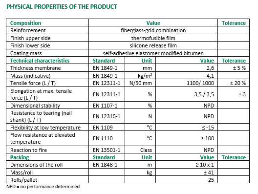 Self-adhesive membrane with a vapour-pressure and tension dispersion system, composed of elastomer modified bitumen and a fiberglass-grid combination reinforcement. Used as a base layer within a multi layer waterproofing system on surfaces where partial adhesion is required. The upper surface is protected by a thermofusible film. The lower surface is provided with self-adhesive bitumen stripes alternated with non-stick stripes protected by a silicone release film. The overlap is partly self-adhesive (to prevent flame transmission) and partly torchable with flame or hot air.