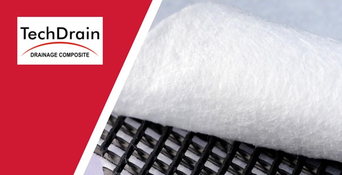 TECHDRAIN is a drainage composite obtained by coupling a two or three-dimensional core of high-density polyethylene polymer and covered by nonwoven geotextile. The drainage core comprises two or three sets of parallel overlaid ribs integrally connected to form a rhomboidal shape, providing high resistance to compressive strength. Filter fabric (PP) is placed on one or both sides of the drainage core to prevent clogging by filtering out fine particles from the surrounding soil.