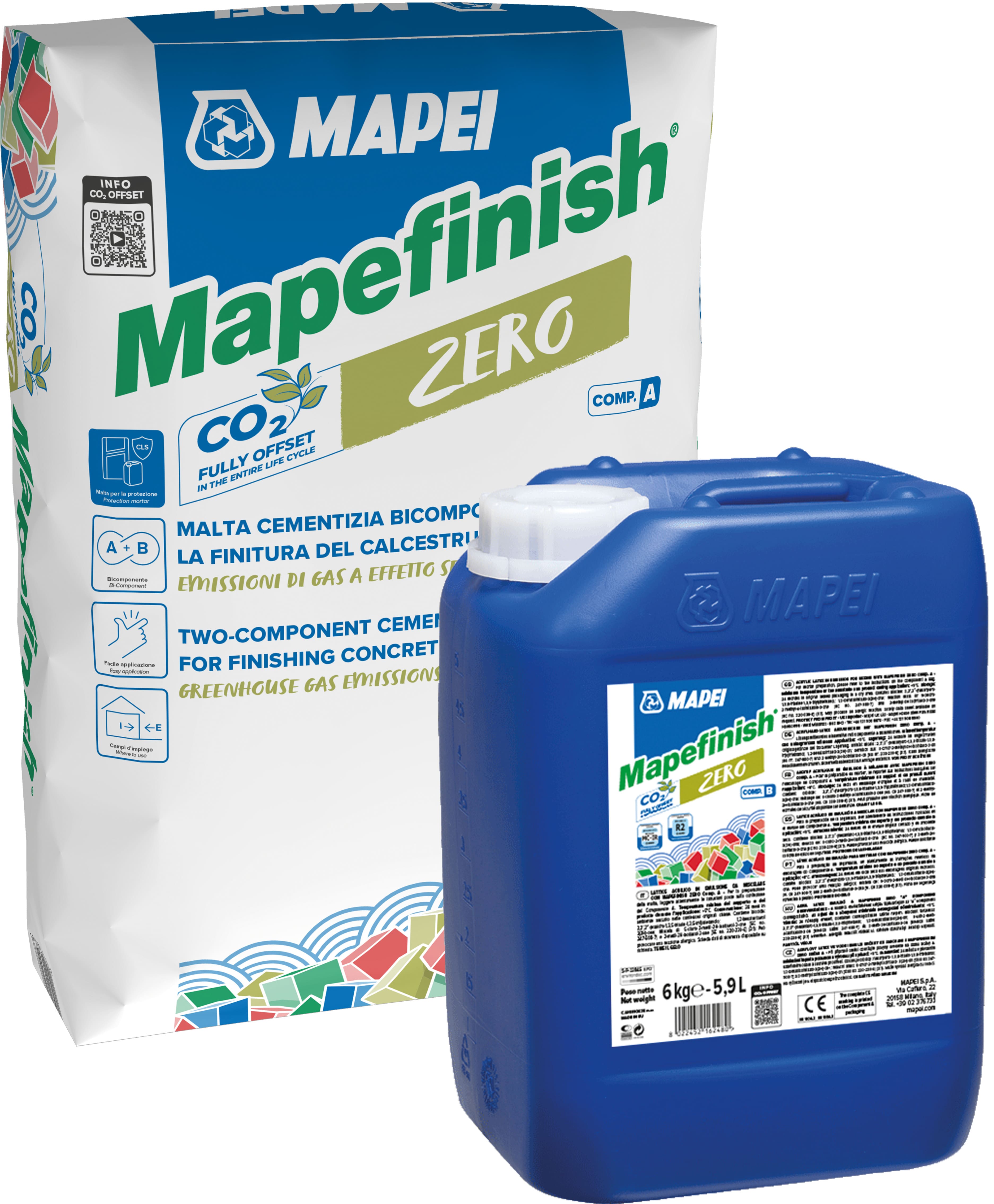 Mapefinish Zero is a two-component mortar based on high strength cements, selected aggregates, special additives, and synthetic polymers in water dispersion for finishing concrete.