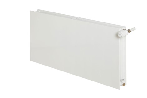 A robust steel panel radiator with a smooth front plate, rounded corners and open sides and top. Sold by Hudevad Radiator Design in Europe to be used in domestic and commercial settings.