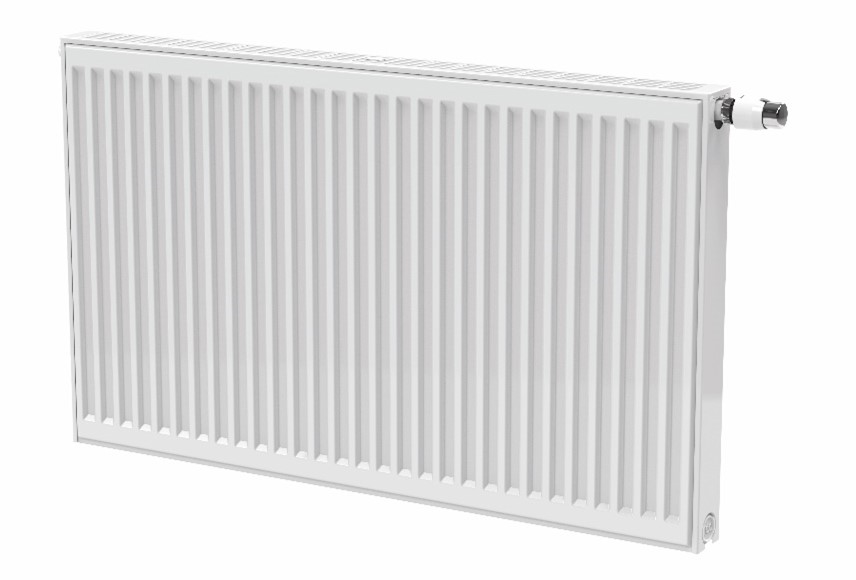 Low-temperature, valved, steel panel radiator with serial flow technology, both centre and lateral bottom connections and a preset valve insert. Produced by Stelrad Group and sold in Scandinavia by Hudevad Radiator Design for use in domestic and commercial settings.
