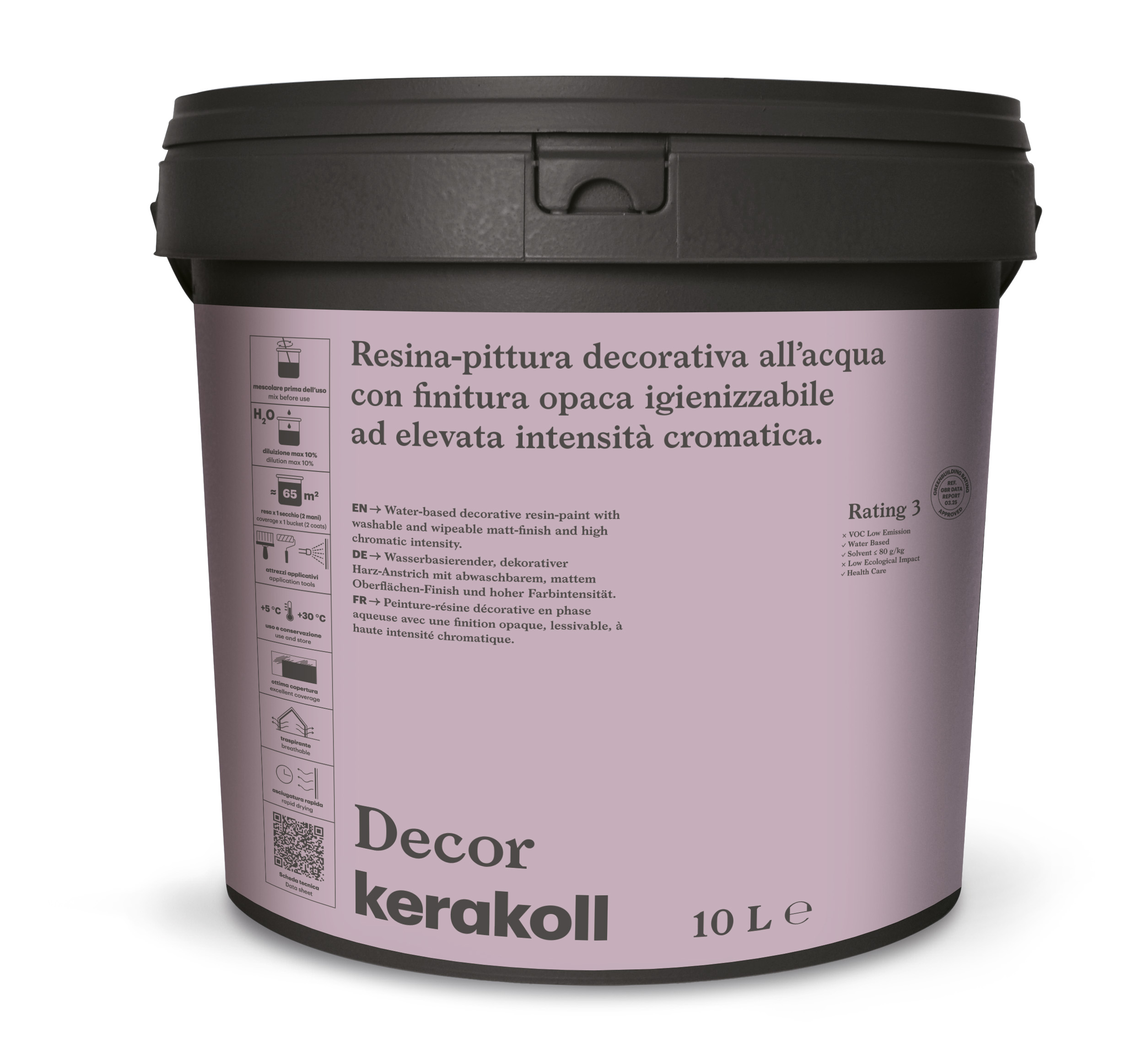 Decor is a water-based decorative resin paint with a matte, sanitizable finish and high colour intensity. Available in 150 colors from the Color Collection and 10 colors from the Warm Collection.