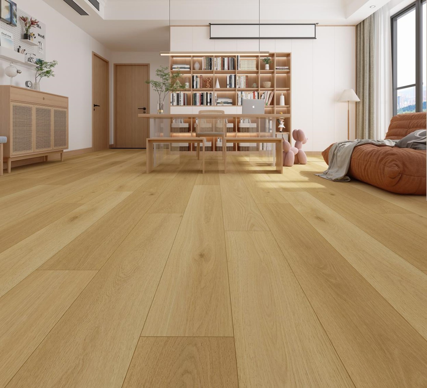 Vinyl Flooring is made primarily from polyvinyl chloride (PVC), calcium carbonate (limestone), additives (such as plasticizers, stabilizers, lubricants, pigments, etc.). It is composed of one clear PVC embossed wear layer with a final UV coating, printing film layer for décor, substrate layer for structural strength and stability, and may include a backing (such as IXPE) to improve acoustic performance and increase comfort underfoot. The product is waterproof, easy to install and maintain.