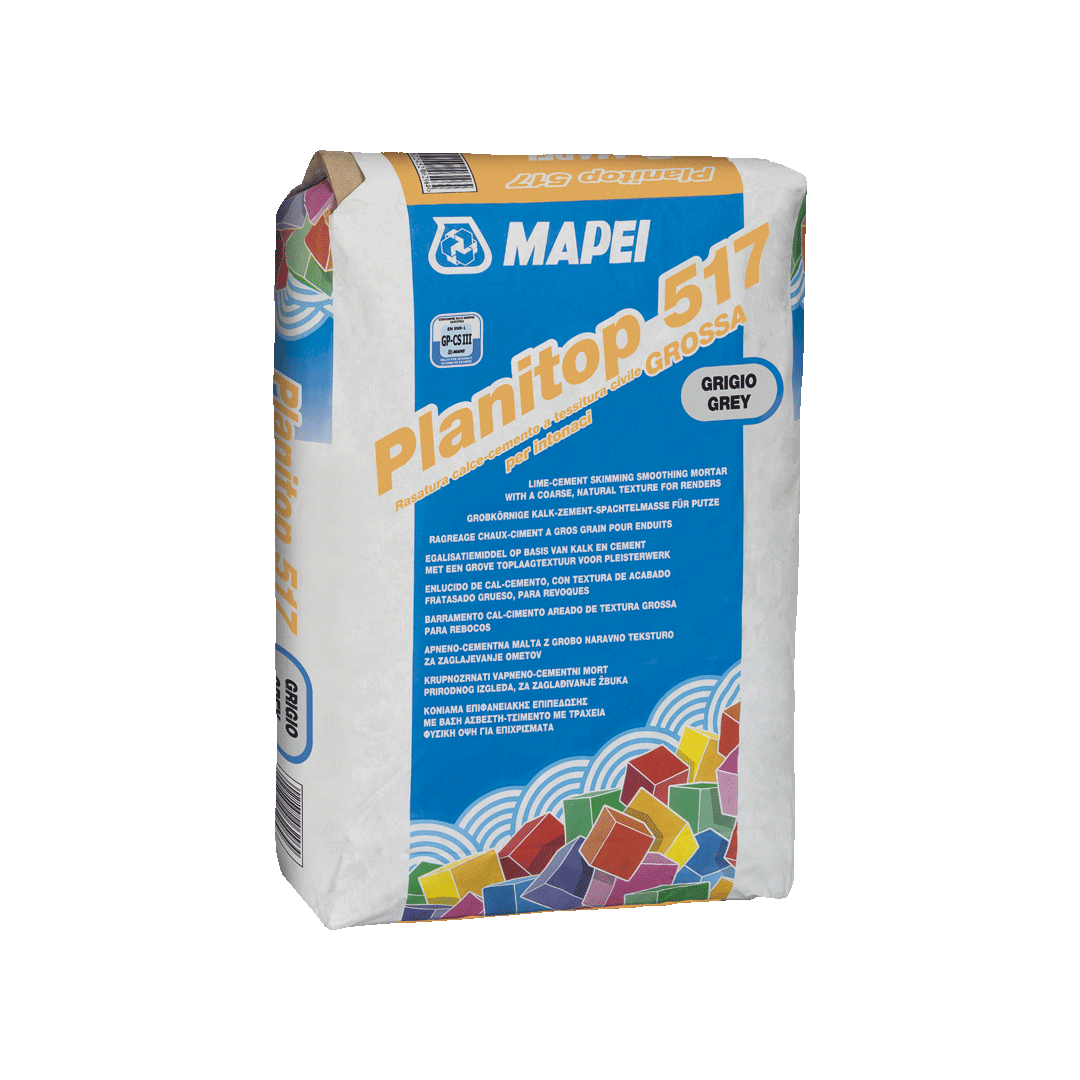 Planitop 517 grey is a one-component, pre-blended, normal-hardening, powdered skimming mortar available in grey and white, made from aerated and hydraulic binders, selected limestone and quartz sand and special powdered additives, according to a formula developed in MAPEI research laboratories. Thanks to its special composition, skimming mortar obtained by mixing Planitop 517 with water has high adhesion strength. It is characterised by its excellent free-flowing property, which makes it easy to apply with a metal trowel and, where required, quick to finish using a sponge float. Planitop 517 may be applied in layers up to 3 mm thick.
